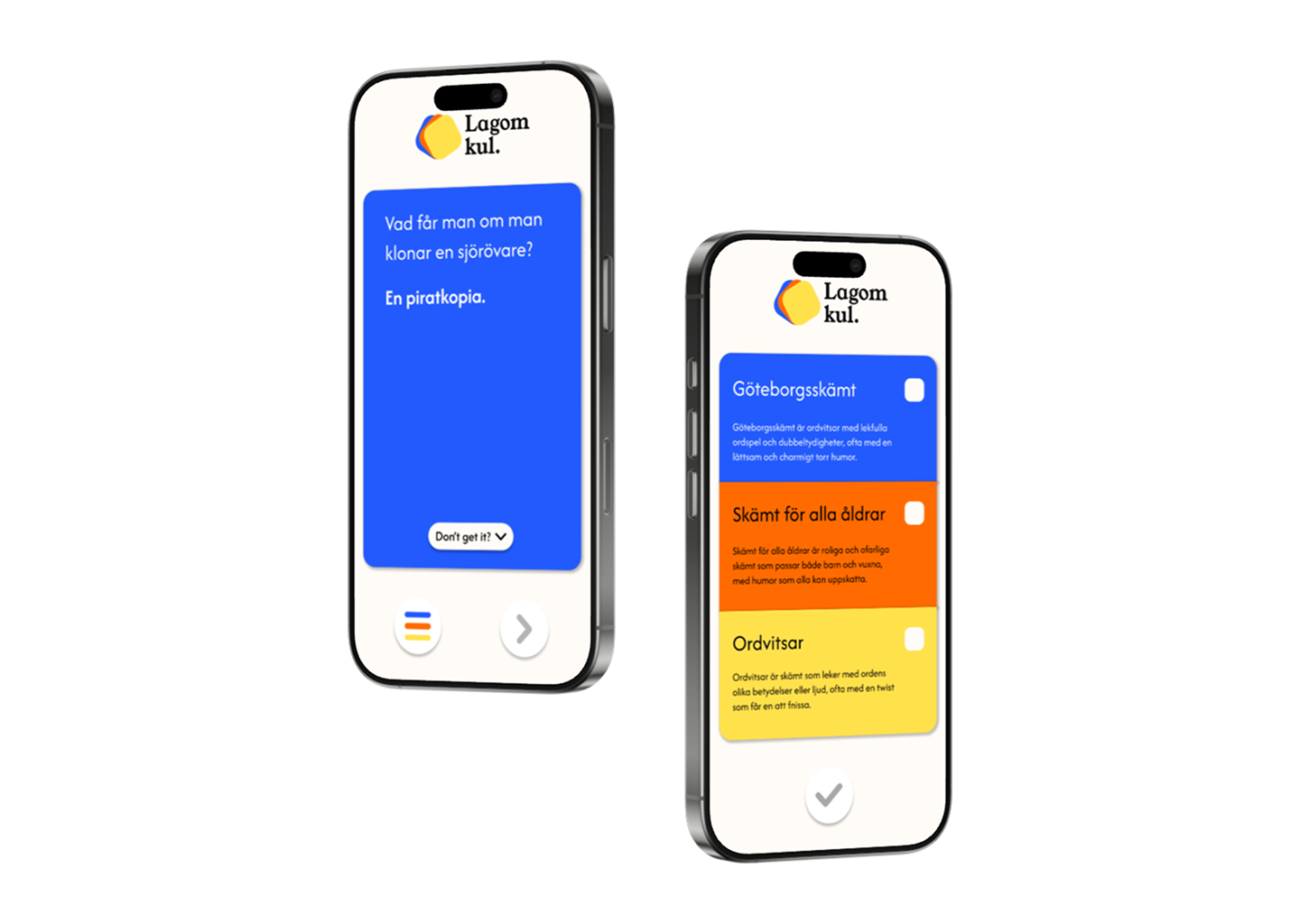 This project was created as part of a collaborative school assignment between UX & developer students in an agile setup. Our job was to identify a real user problem and design a digital solution that could meaningfully address it. We focused on supporting immigrants learning the Swedish by helping them understand both the language and the cultural nuances of humor through Swedish jokes. Over multiple sprints, we researched the problem space, designed and tested the user experience, and worked with developers to bring the concept to life as a mobile app featuring a swipe-based joke feed with different category options.